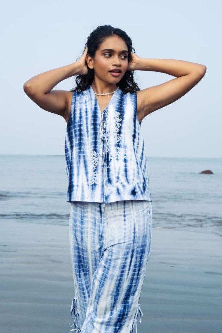 The Vest features a relaxed V-neckline with a delicate tie-up detail, this airy silhouette is elevated by intricate white embroidery cascading down the front. The fluid cotton fabric and vibrant dye pattern make it a versatile piece—perfect for pairing with shorts, skirts, or layered looks